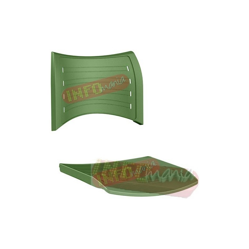 Encosto confeccionado em polipropileno (PP) de alta resistência pelo sistema de injeção termoplástica, medindo 465 mm de largura, 320 mm de altura e espessura de 20 mm (na borda). A fixação é feita através de encaixes retangulares e trava-se através de pino-tampão também confeccionado em polipropileno (PP) da mesma cor do encosto.