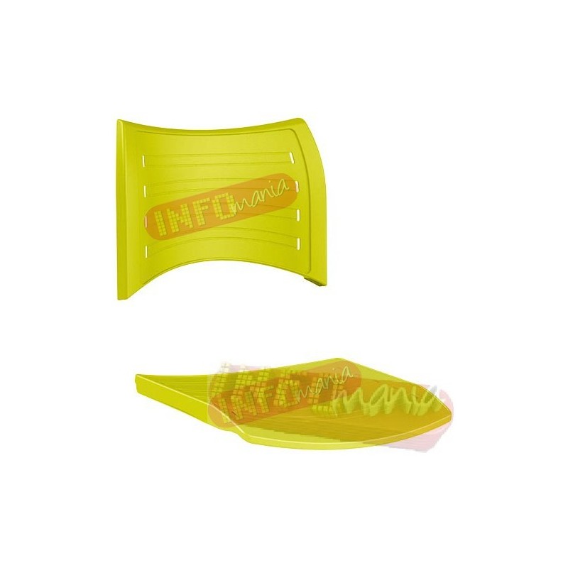 Encosto confeccionado em polipropileno (PP) de alta resistência pelo sistema de injeção termoplástica, medindo 465 mm de largura, 320 mm de altura e espessura de 20 mm (na borda). A fixação é feita através de encaixes retangulares e trava-se através de pino-tampão também confeccionado em polipropileno (PP) da mesma cor do encosto.